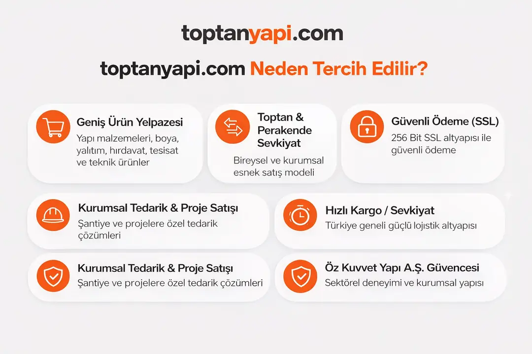 Yapı malzemeleri, boya, yalıtım, hırdavat, tesisat ve teknik ürünler başta olmak üzere; bireysel kullanıcıların ve profesyonel ekiplerin ihtiyaç duyduğu tüm ürünleri tek bir platformda bir araya getiriyoruz. Toptan ve perakende satış modelimizle, doğru ürünü doğru fiyatla ve hızlı sevkiyat avantajıyla sunuyoruz.